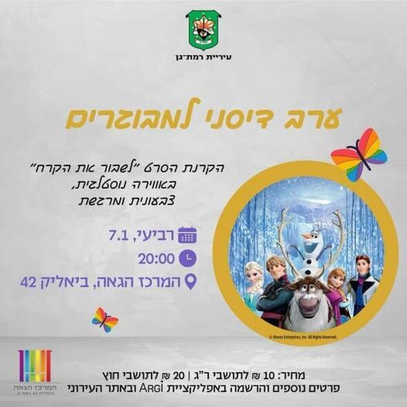 המרכז הגאה של רמת גן מקיים אירוע מיוחד תחת הכותרת "ערב דיסני למבוגרים". במסגרת האירוע, תתקיים צפייה משותפת בסרט האנימציה המצליח "לשבור את הקרח".