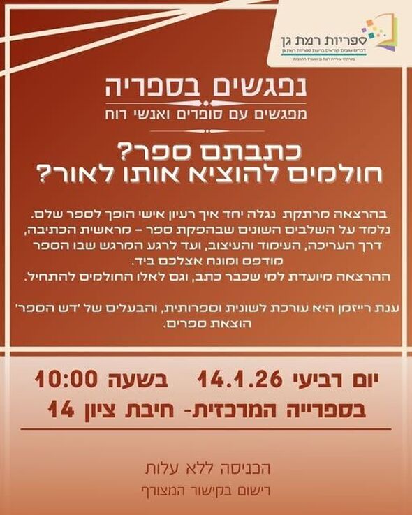 רשת הספריות העירוניות ברמת גן מזמינה את הקהל הרחב למפגש מיוחד המיועד לכותבים ולחולמים להוציא ספר לאור. המפגש נועד להפוך את הדרך מהמגירה למדף הספרים לברורה ונגישה יותר עבור היוצרים.