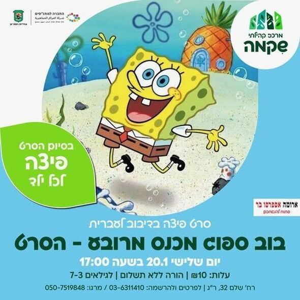 אירוע "סרט פיצה" לילדים במרכז קהילתי רמת שיקמה רמת גן: הקרנת "בוב ספוג מכנס מרובע" ב-20.1.26