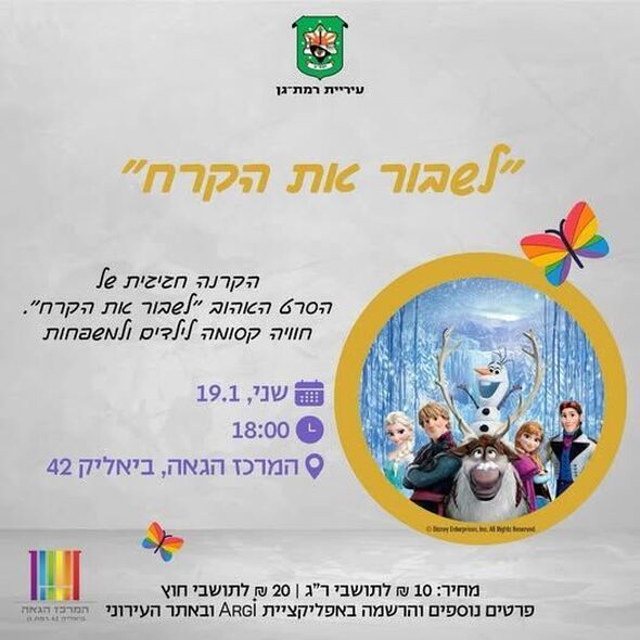 במרכז הגאה ברמת גן תתקיים הקרנה מיוחדת של הסרט "פרוזן", המיועדת לכל המשפחה. האירוע מציע חוויה משפחתית גאה ואווירה מהנה הכוללת פופקורן, והוא מתאים לילדים, ילדות והורים.