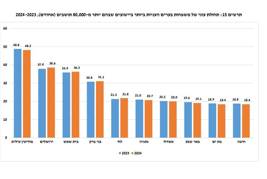 בחלוקה לפי יישובים (מעל 80,000 תושבים), העיר הענייה ביותר היא מודיעין עילית עם תחולת עוני של 48.2%, ולאחריה ירושלים עם 38.6%. שכיחות גבוהה של עוני נרשמה ביישובים עם שיעור גבוה של אוכלוסייה ערבית או חרדית ובפריפריה הגיאוגרפית.