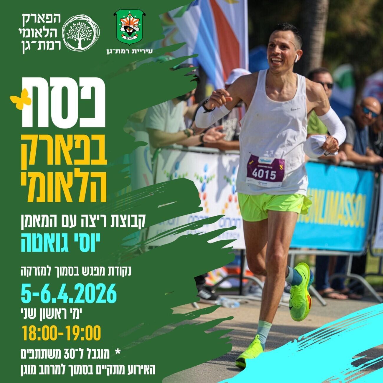 קבוצת הריצה תפעל בהדרכת המאמן יוסי גואטה. הפעילות תתקיים בשני התאריכים (5-6 באפריל) ונקודת המפגש תהיה בסמוך למזרקה בפארק הלאומי.