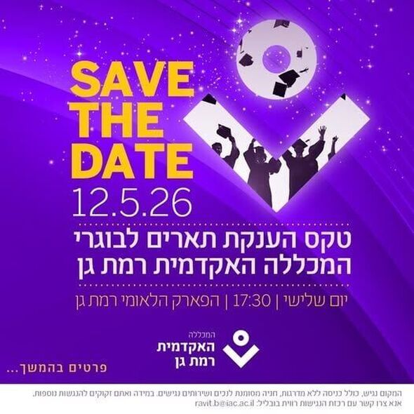 המכללה האקדמית רמת גן הודיעה כי טקס הענקת התארים לבוגרים ולמוסמכים של המוסד יתקיים בחודש הבא, ביום שלישי, ה-12 במאי 2026.