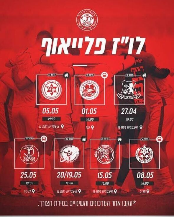 מועדון הכדורגל הפועל רמת-גן גבעתיים מתכונן לחלק המכריע של העונה, ופרסם את לוח הזמנים המלא למשחקי הפלייאוף שייערכו במהלך החודשים אפריל ומאי.