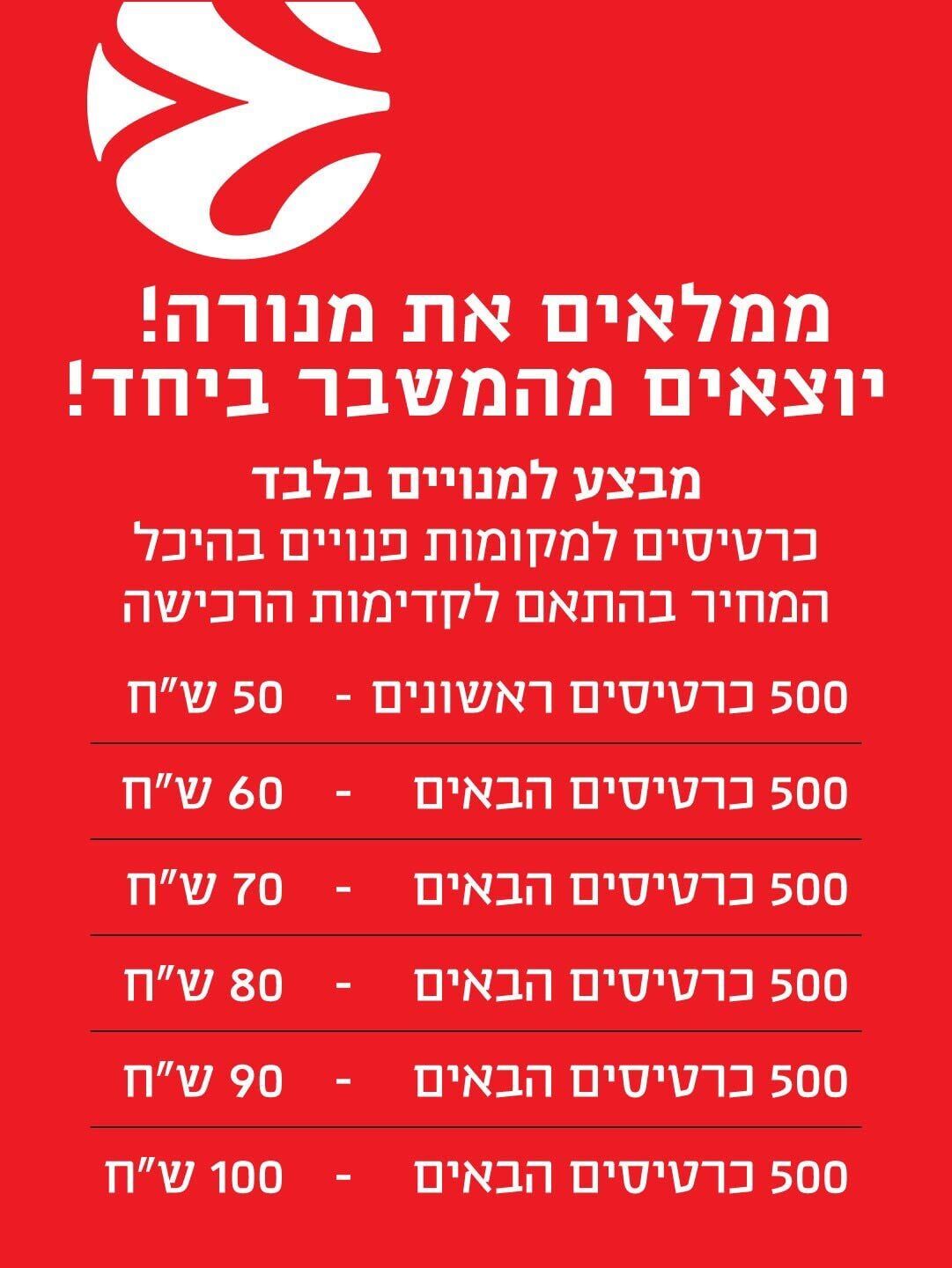 מחירי הכרטיסים במבצע נקבעו במודל מדורג בהתאם לקדימות הרכישה. על פי המחירון שפורסם, 500 הכרטיסים הראשונים יימכרו במחיר של 50 ש"ח. לאחר מכן, המחיר יעלה בהדרגה: 500 הכרטיסים הבאים יעלו 60 ש"ח, המדרגה הבאה תעמוד על 70 ש"ח ל-500 כרטיסים, וכן הלאה במדרגות של 10 ש"ח, עד למחיר של 100 ש"ח ל-500 הכרטיסים האחרונים שיוצעו במסגרת זו.