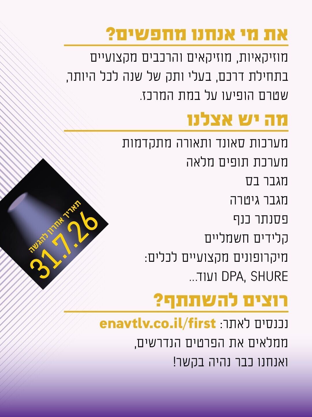 קול קורא למוזיקאים בתחילת דרכם: מרכז ענב לתרבות בתל אביב מזמין להשתתף בפסטיבל "בכורות" (מועד אחרון: 31.07.2026)