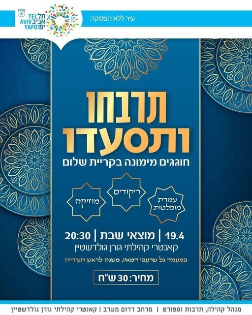 קאנטרי גורן גולדשטיין מזמין את תושבי קריית שלום לחגיגות מימונה קהילתית עם מופלטות, מוזיקה והפתעות במוצאי שבת 19.4 . מחיר 30 שח