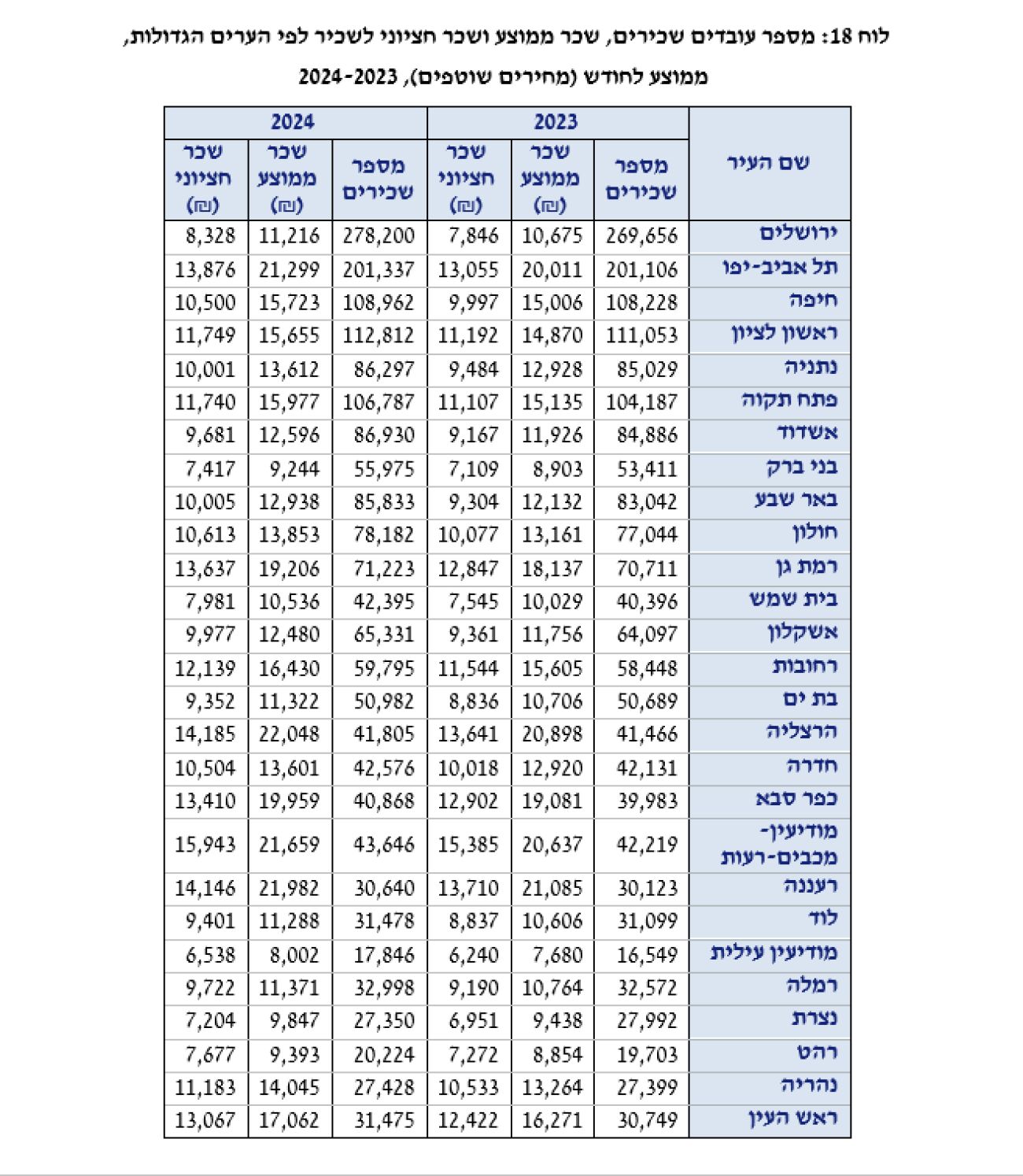 מבין 27 הערים הגדולות בישראל (עם מעל 75 אלף תושבים) השכר הממוצע הגבוה ביותר (בשנים 2023-2024) נמצא ברעננה עם 21,534 ש"ח, הרצליה עם 21,473 ש"ח, מודיעין מכבים רעות 21,148 ש"ח ותל אביב 20,655.