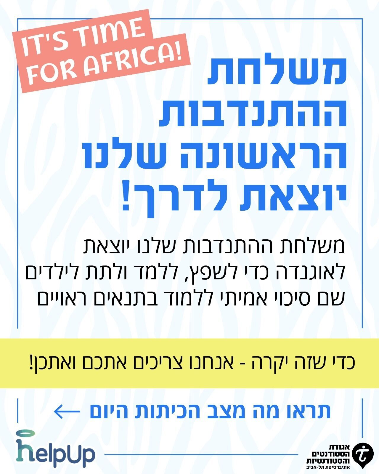 משלחת סטודנטים ראשונה מטעם אגודת הסטודנטים והסטודנטיות של אוניברסיטת תל אביב יצאה לדרך לאוגנדה. המשלחת, הכוללת 22 סטודנטים וסטודנטיות מכלל הפקולטות באוניברסיטה, תשהה במדינה במשך שבועיים ותתמקד בעשייה חברתית. הפרויקט מתקיים בשיתוף עם עמותת HelpUp.