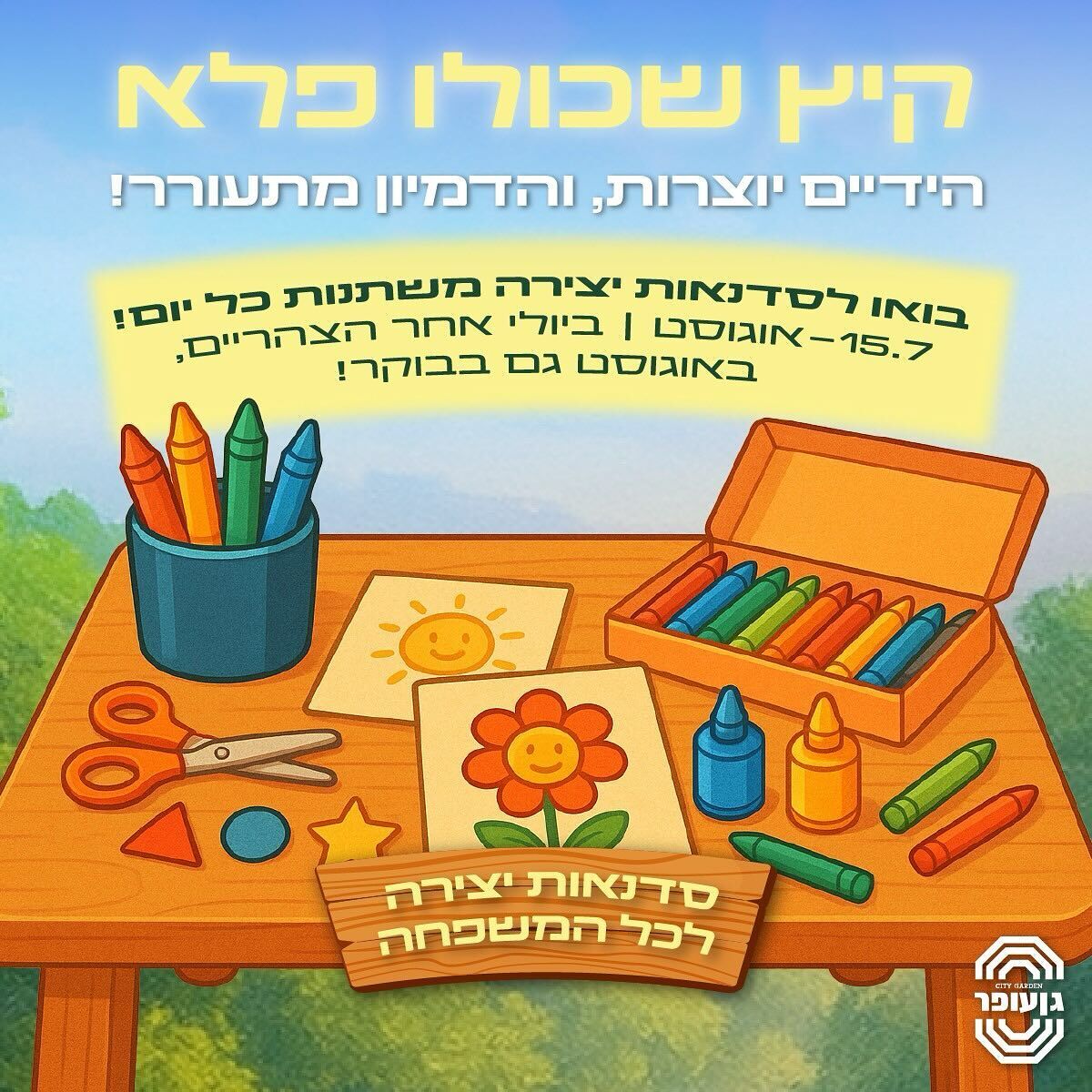 החל מתאריך 15 ביולי, יתקיימו בגן סדנאות יצירה יומיות המיועדות לכל הגילים.