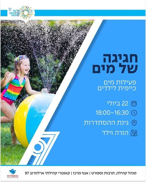 קאנטרי ארלוזורוב וההסתדרות מזמינים את הציבור ל"חגיגת מים" שתתקיים בגינת ההסתדרות ביום שלישי, 22 ביולי. האירוע מתואר כפעילות מים רב-גילאית, מהנה ומרעננת, המיועדת לצנן את הקיץ עם מגוון אטרקציות.