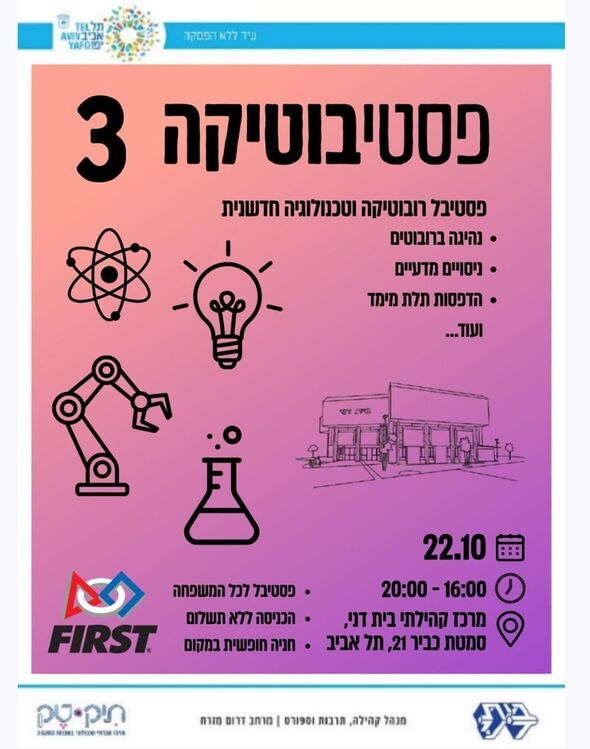 פסטיבל הרובוטיקה הגדול בישראל, "פסטיבוטיקה", יתקיים השנה ביום רביעי, 22.10.2025, בין השעות 16:00–20:00 במרכז הקהילתי בית דני, הממוקם בסמטת כביר 21 בשכונת התקווה בתל אביב. האירוע, פרי שיתוף פעולה של ארגון FIRST Israel, קבוצות הרובוטיקה של תל אביב והמרכז הקהילתי בית דני, מזמין את הקהל הרחב לקחת חלק בחגיגה של טכנולוגיה וחדשנות.
