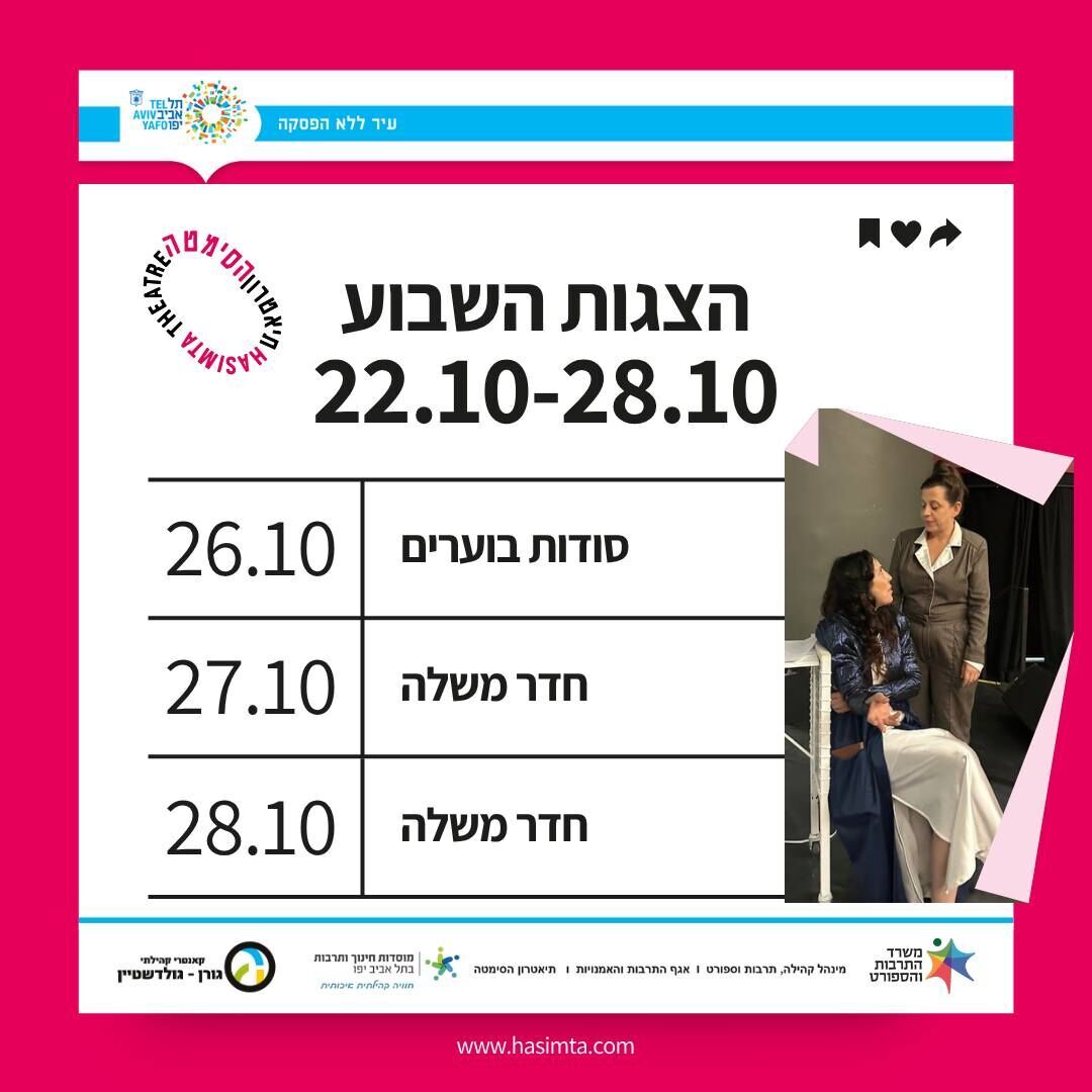 תיאטרון הסימטה פרסם את לוח ההצגות לשבוע הקרוב, שיתקיים בין התאריכים 22 ל-29 באוקטובר. הקהל מוזמן ליהנות ממגוון הצגות ומופעים.