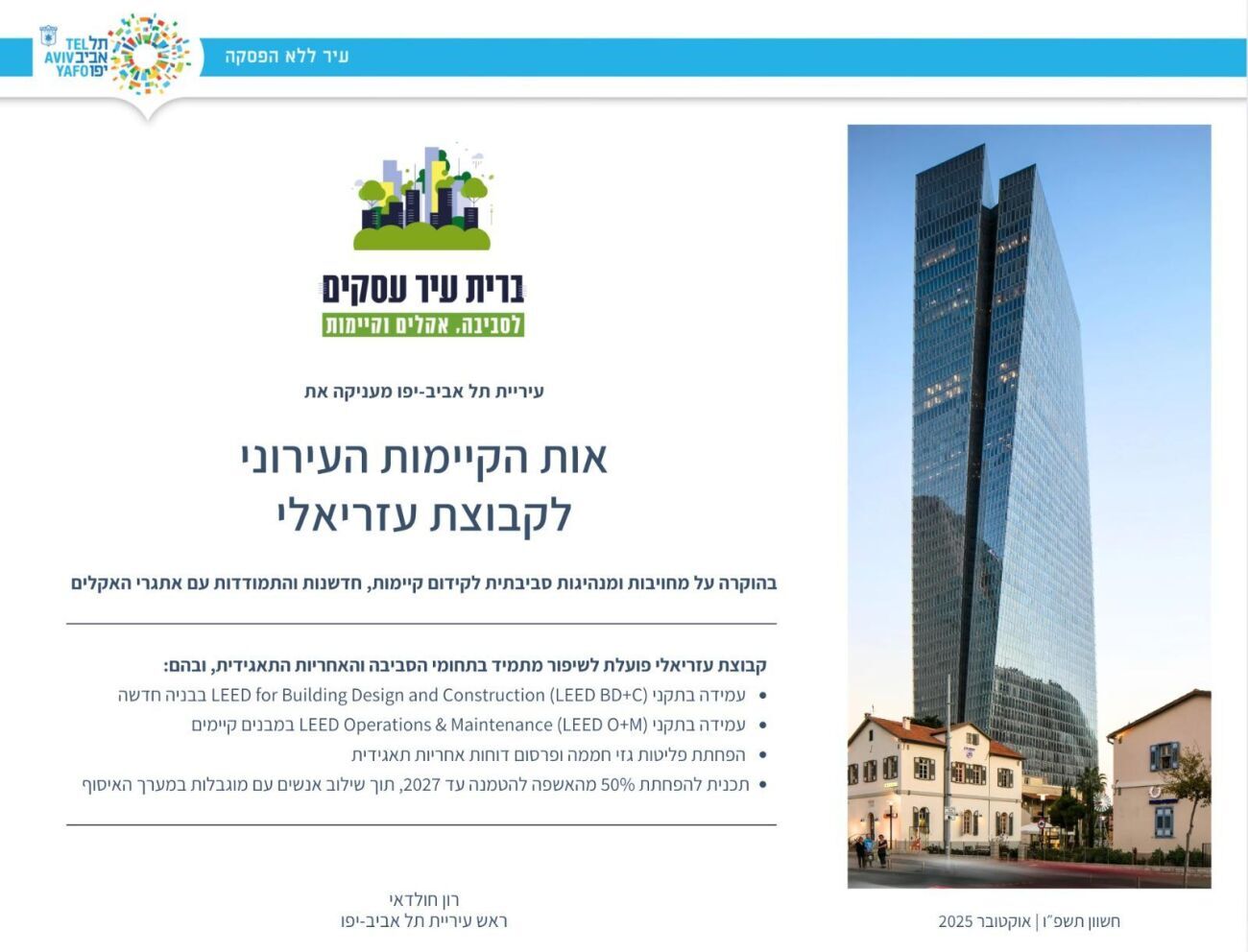 עיריית תל אביב-יפו העניקה הבוקר (ב') את אות הקיימות העירוני לקבוצת עזריאלי, במסגרת תכנית "ברית עיר-עסקים לסביבה, אקלים וקיימות". את האות העניק ראש העירייה רון חולדאי, לגב' דנה עזריאלי, יו"ר וממלאת מקום מנכ"ל הקבוצה, בטקס חגיגי שנערך במגדל עזריאלי שרונה. ההוקרה ניתנה על מחויבותה המתמשכת לקידום קיימות עירונית ועל הובלה ארוכת שנים באימוץ תקני ESG כמרכיב מרכזי באסטרטגיה העסקית של הקבוצה.