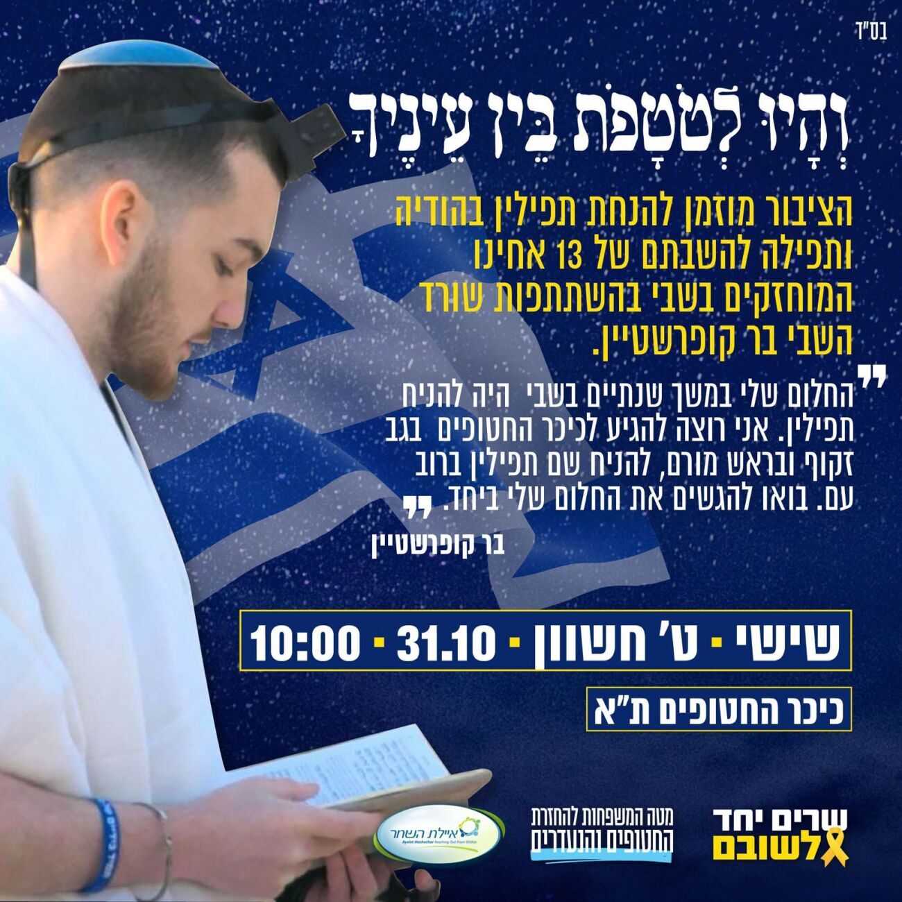 לדברי המטה, קופרשטיין יניח תפילין בהודיה על שובו מהשבי. המעמד יהווה גם תפילה וקריאה משותפת להשבתם המיידית של כל 13 החטופים שעדיין מוחזקים בשבי.