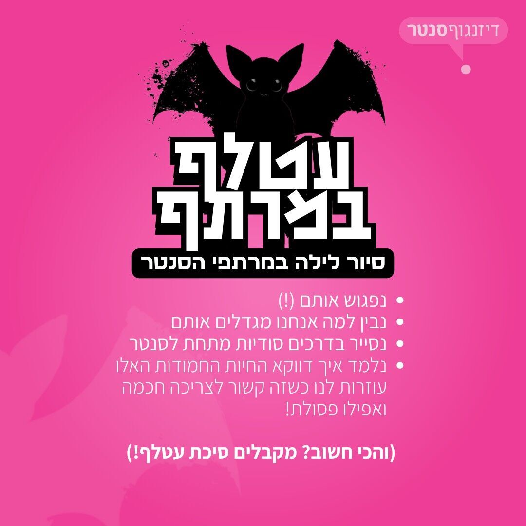 עטלף במרתף - הקשר בין עטלפים לבלאק פריידי: סיור במבנים התת-קרקעיים של הסנטר שיעסוק באופן בו העטלפים מסייעים בצריכה חכמה ובהתמודדות עם פסולת. הסיור יתקיים ביום שני, 17.11, בשעה 17:00. להרשמה ניתן ללחוץ כאן.