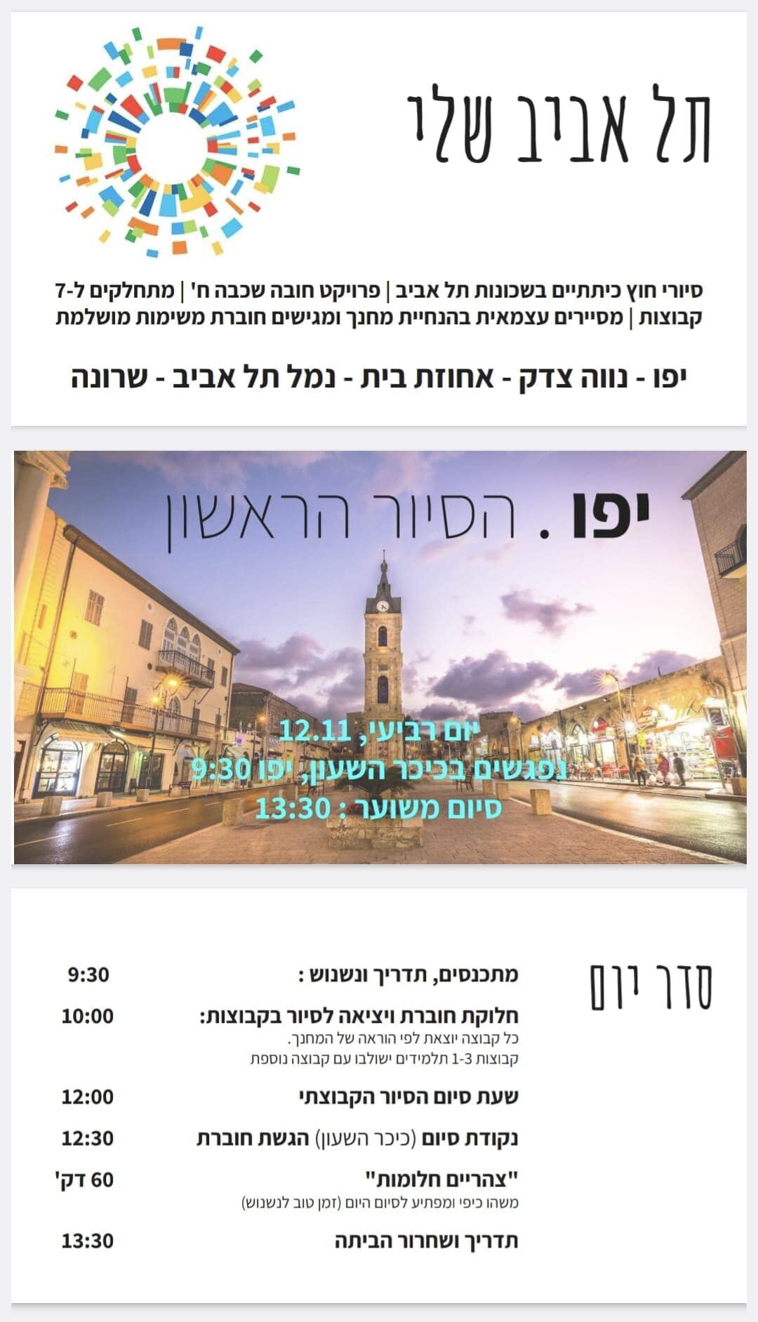 הראשונים לצאת לדרך היו תלמידי כיתות ח'9 ו-ח'7, בליווי המחנכים רפאל בוקר ואחיעד שריג, שביצעו השבוע את הסיור ביפו ופתחו בכך את הפרויקט השנתי.