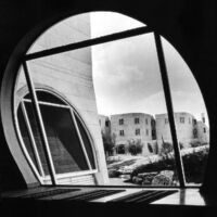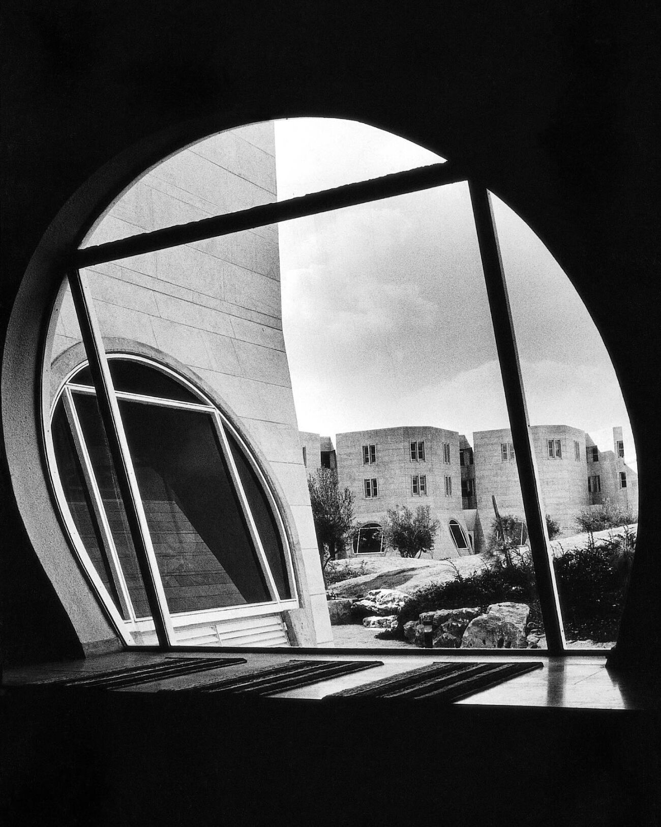 צילום:רם כרמי בדירתו בבית רוזמרין, הרצליה, ראשית שנות ה-2000. צילום: איתן הלל. רם כרמי, עדה-כרמי מלמד, חיים קצף ובן פלג, בניין הפקולטה למדעי הרוח, קמפוס הר הצופים של האוניברסיטה העברית, ירושלים, 1970-74: מבט מה״רחוב״ הפנימי אל הגן (צילום: טל לוי)