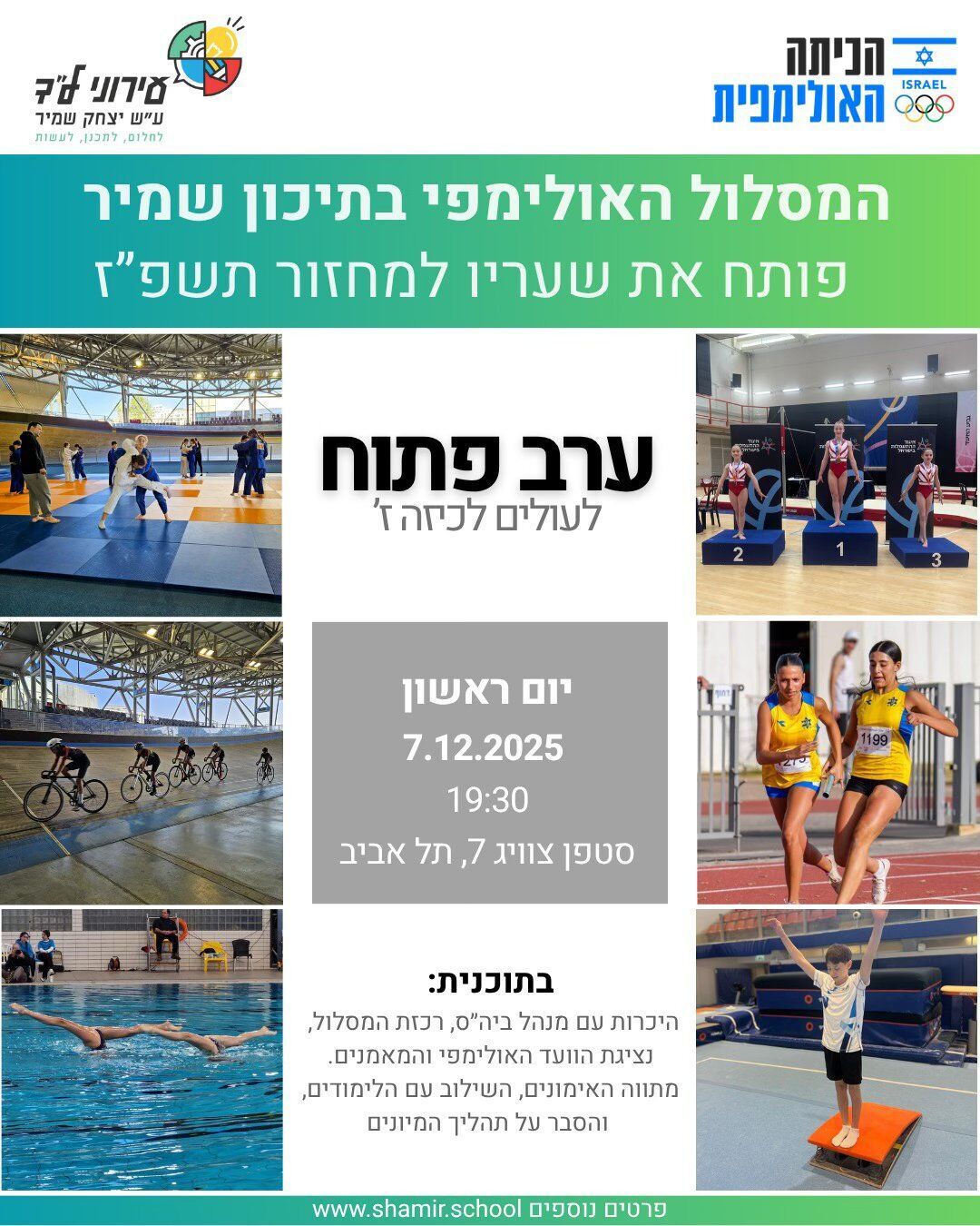 תיכון שמיר בתל אביב פותח את עונת הרישום: ערבי חשיפה למסלול האולימפי ולמסלול המנהיגות הגלובלית יתקיימו במהלך חודש דצמבר
