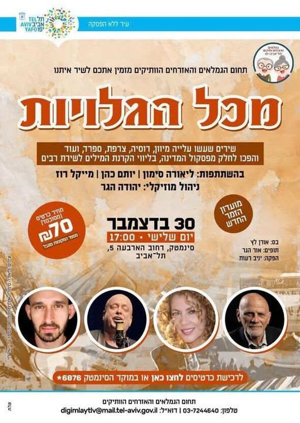 תחום הגמלאים והאזרחים הוותיקים בתל אביב-יפו מזמין את הציבור להצטרף למועדון הזמר החדש של גמלאי העיר. המפגש הקרוב יוקדש למופע תחת הכותרת "מכל הגלויות", הכולל שירים שעשו עלייה מיוון, רוסיה, צרפת, ספרד ועוד, והפכו לחלק בלתי נפרד מפסקול המדינה.