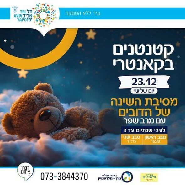 בקאנטרי הקהילתי גורן גולדשטיין בתל אביב-יפו תתקיים פעילות מיוחדת לפעוטות תחת הכותרת "מסיבת השינה של הדובים". האירוע ייערך ביום שלישי, ה-23 בדצמבר.
