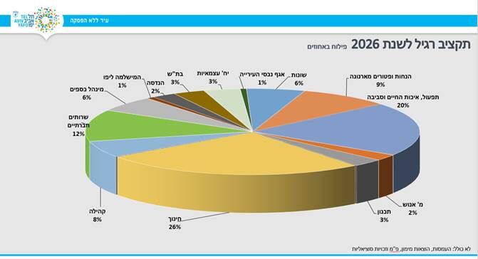 מועצת עיריית תל אביב-יפו אישרה אמש (שני, 29.12) את הצעת התקציב לשנת 2026. התקציב הכולל לשנה זו עומד על כ-10 מיליארד שקלים, כאשר התקציב הרגיל מסתכם ב-8.07 מיליארד שקלים (גידול של 520 מיליון ש"ח בהשוואה לשנת 2025) והתקציב הבלתי רגיל (תקציב הפיתוח) עומד על 2.245 מיליארד שקלים, המהווים גידול של 635 מיליון ש"ח לעומת בסיס התב"ר של השנה שעברה.