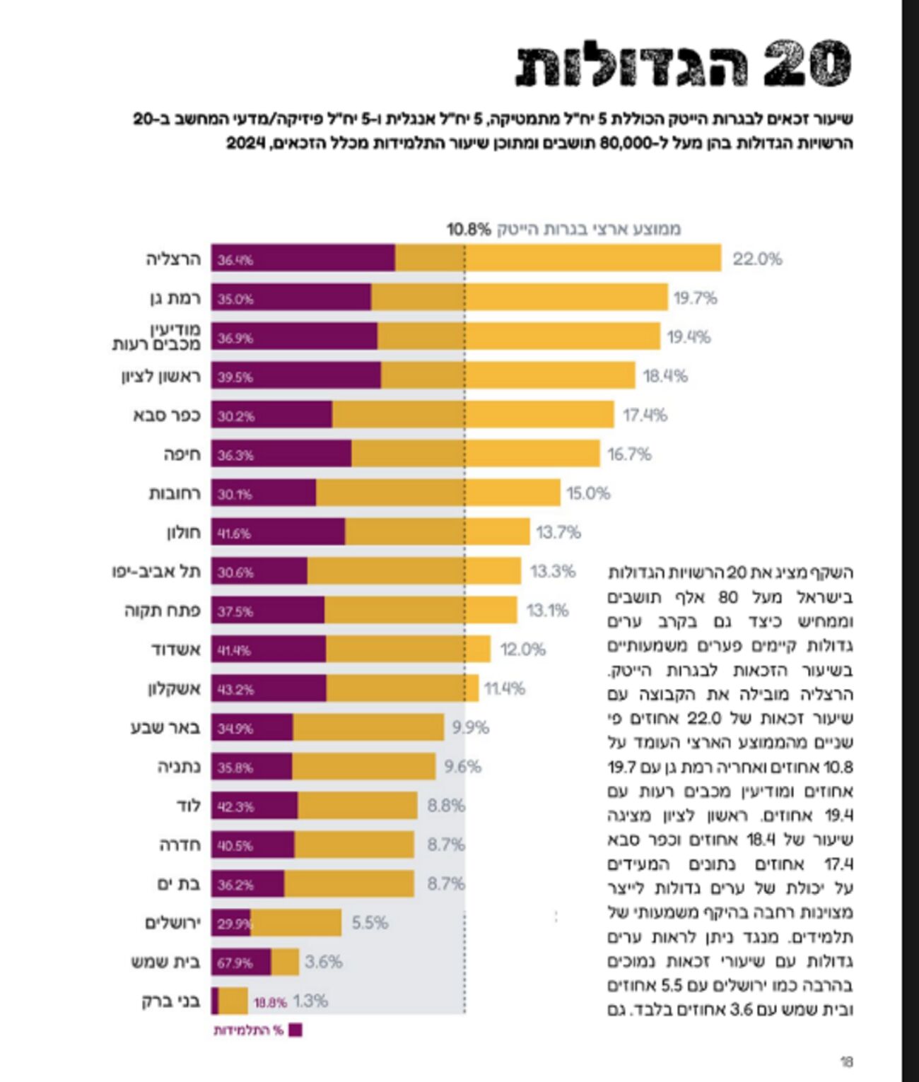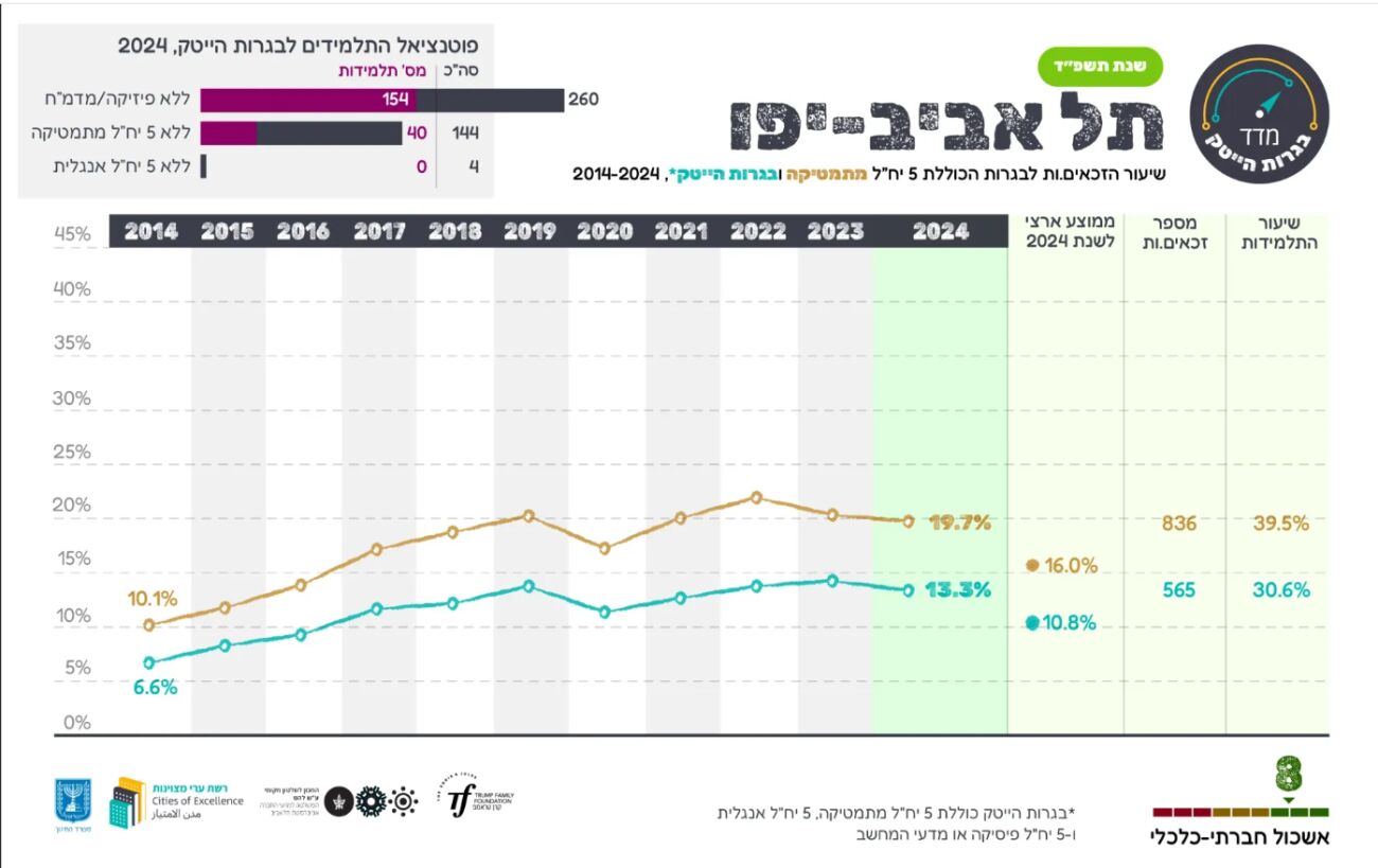 רשת ערי מצוינות, בניהול המכון לשלטון מקומי באוניברסיטת תל אביב וביוזמת קרן טראמפ, פרסמה השבוע את דוח המצוינות השנתי. הדוח בוחן את שיעור הזכאים ל'בגרות הייטק', הכוללת 5 יחידות לימוד במתמטיקה, אנגלית ומדעי המחשב או פיזיקה, ומתייחס לשנת הלימודים תשפ"ד (2023-2024), שנה שבתחילתה התרחש טבח ה-7 באוקטובר.