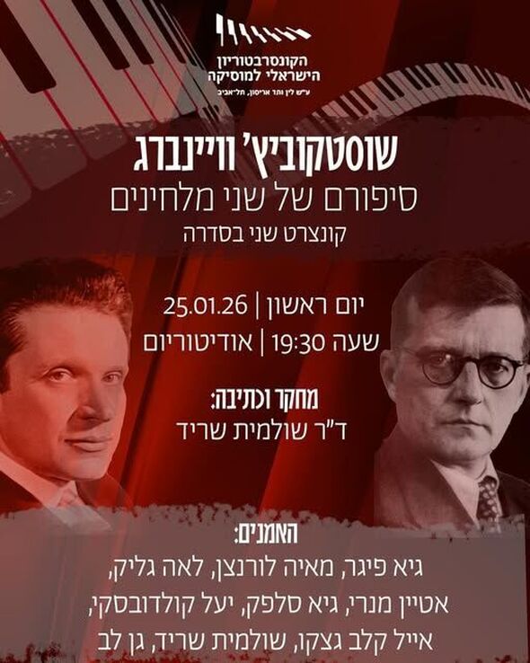 קונצרט הרצאה בקונסרבטוריון הישראלי למוסיקה תל אביב: סיפורם של המלחינים שוסטקוביץ׳ וויינברג בימי מלחמת העולם השנייה יתקיים יום ראשון, 25.1.26