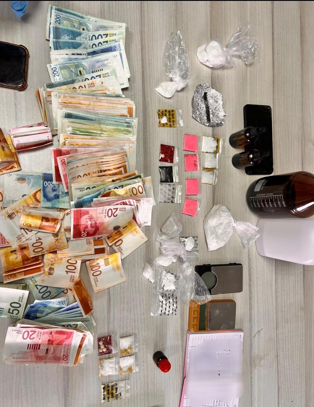 במהלך החיפוש בדירה נתפסו חומרים רבים החשודים כסמים שונים, וכן כסף מזומן, כמפורט להלן: