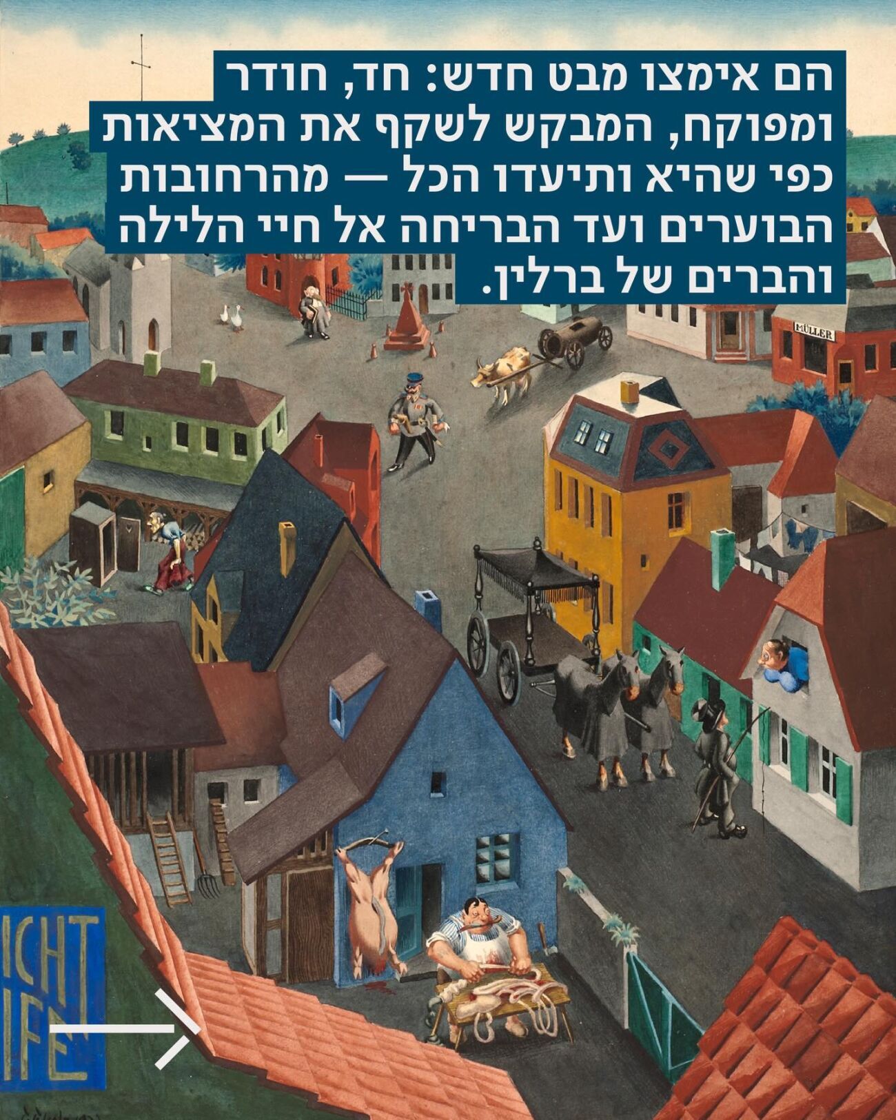 צילומים:רודולף שליכטר, עוברי־אורח וחיילים, 1925-26, אוסף פרטי; רודולף שליכטר, דיוקן קרולה נֵהֶר, 1929; גיאורג שולץ, יום בעיירה גרמנית, 1922; אורל-רנה בארו, דיוקן עצמי; גיאורג שרימפף, טבע דומם עם קקטוס, 1925; כריסטיאן שטג, דיוקן אנה גביונטה, 1927