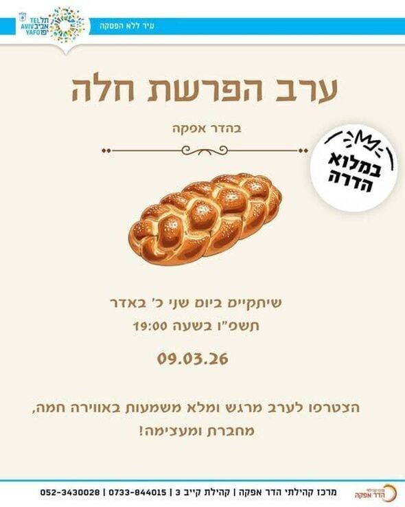 מרכז קהילתי הדר אפקה מזמין את תושבי האזור לערב מיוחד ומלא משמעות של הפרשת חלה. האירוע מציע הזדמנות לקחת חלק ברגע של אחדות, אמונה ושמחה באווירה חמה, מחברת ומעצימה.