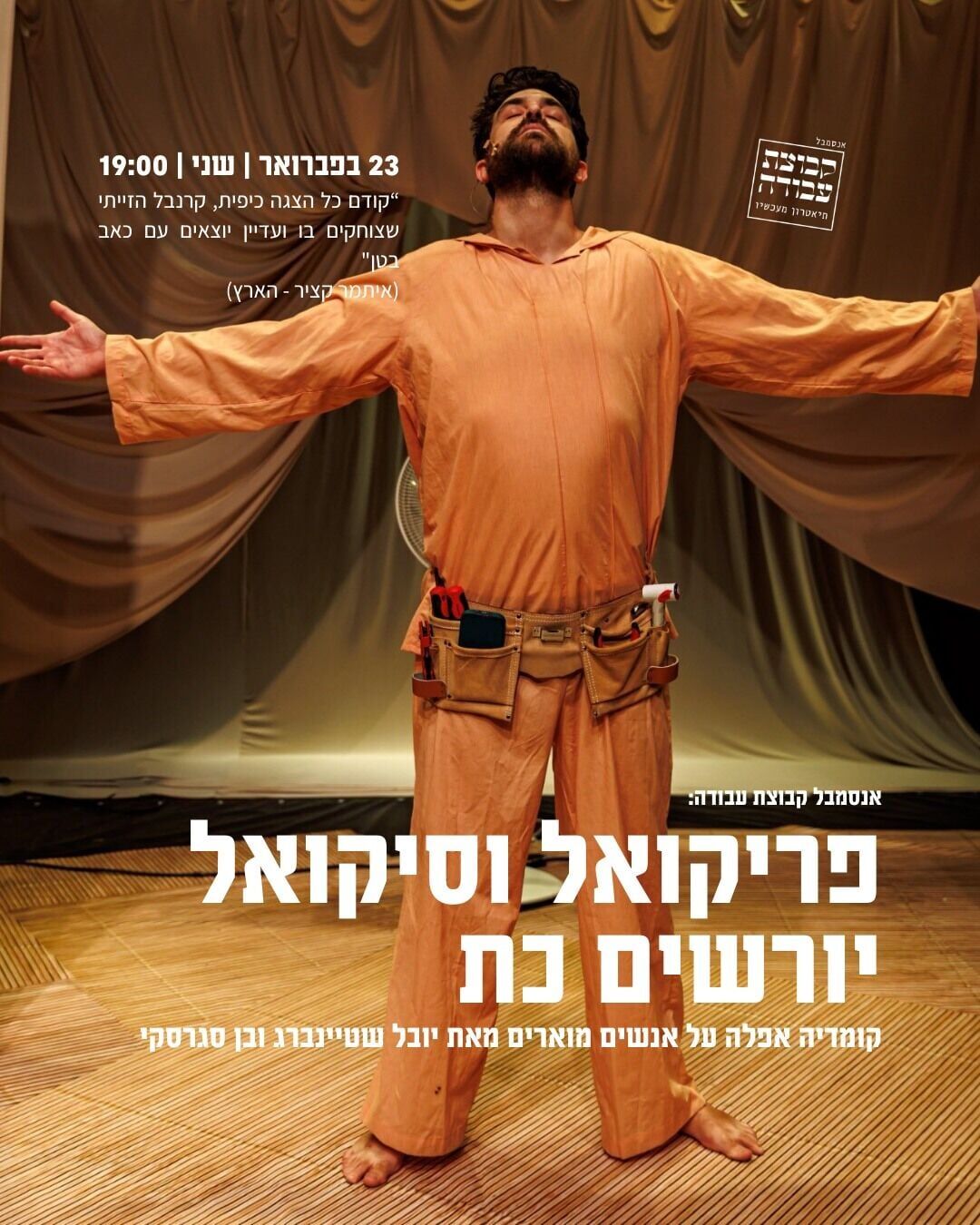 סוף השבוע מציע גם אפשרויות לכל המשפחה. בשעה 11:00 יעלו שתי הצגות בוקר לילדים: "החולד הקטן" והמופע "קסמים בשחקים" – המשלב אקרובטיקה וקוסמות. בערב, בשעה 19:00, תעלה היצירה החדשה "האוויר הוא של כולם" – סיפור על שני אחים, שני מזרנים ומורשת משפחתית מפוקפקת. את השבוע יחתום בשעה 21:00 מופע להקה ב-360 מעלות של הוד שגב.
