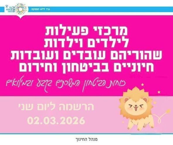 מינהל החינוך בעיריית תל אביב-יפו הודיע כי הוא מפעיל היום (שני, 2 במרץ 2026) מרכזי שמרטפיות לילדיהם של עובדות ועובדים חיוניים בתחומי הביטחון והחירום. השירות מיועד לאנשי כוחות הביטחון המשרתים בקבע ובמילואים, וכן לעובדי עירייה חיוניים, במסגרת מבצע "שאגת הארי".