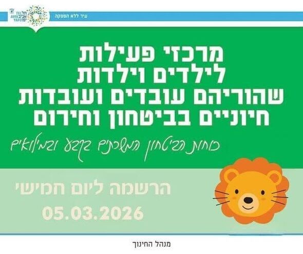 המרכזים יפעלו מחר, יום חמישי, 5 במרץ 2026, בין השעות 08:00 ל-13:30. הם יספקו מענה לילדות וילדים תושבי תל אביב-יפו בגילי 3 עד 7 (תלמידי גני ילדים ועד כיתה ב' בלבד).