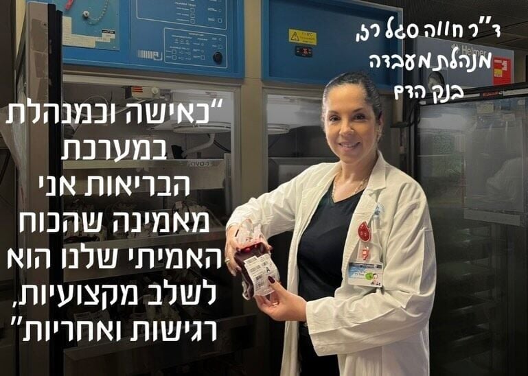 - ד"ר חווה סגל רז, מנהלת מעבדה בנק הדם: "כאישה וכמנהלת במערכת הבריאות אני מאמינה שהכוח האמיתי שלנו הוא לשלב מקצועיות, רגישות ואחריות."