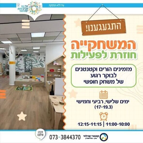 קאנטרי קהילתי גורן גולדשטיין בתל אביב-יפו מודיע על חזרתה לפעילות של המשחקייה. הקאנטרי פותח את שעריו לפעילות בוקר המיועדת להורים ולקטנטנים, מגיל לידה ועד גיל 5, במטרה לאפשר זמן איכות, בוקר רגוע ומשחק חופשי ומהנה.
