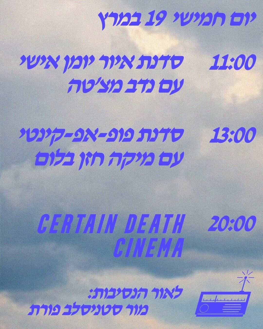 - 20:00 - הקרנת Certain Death Cinema.
