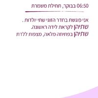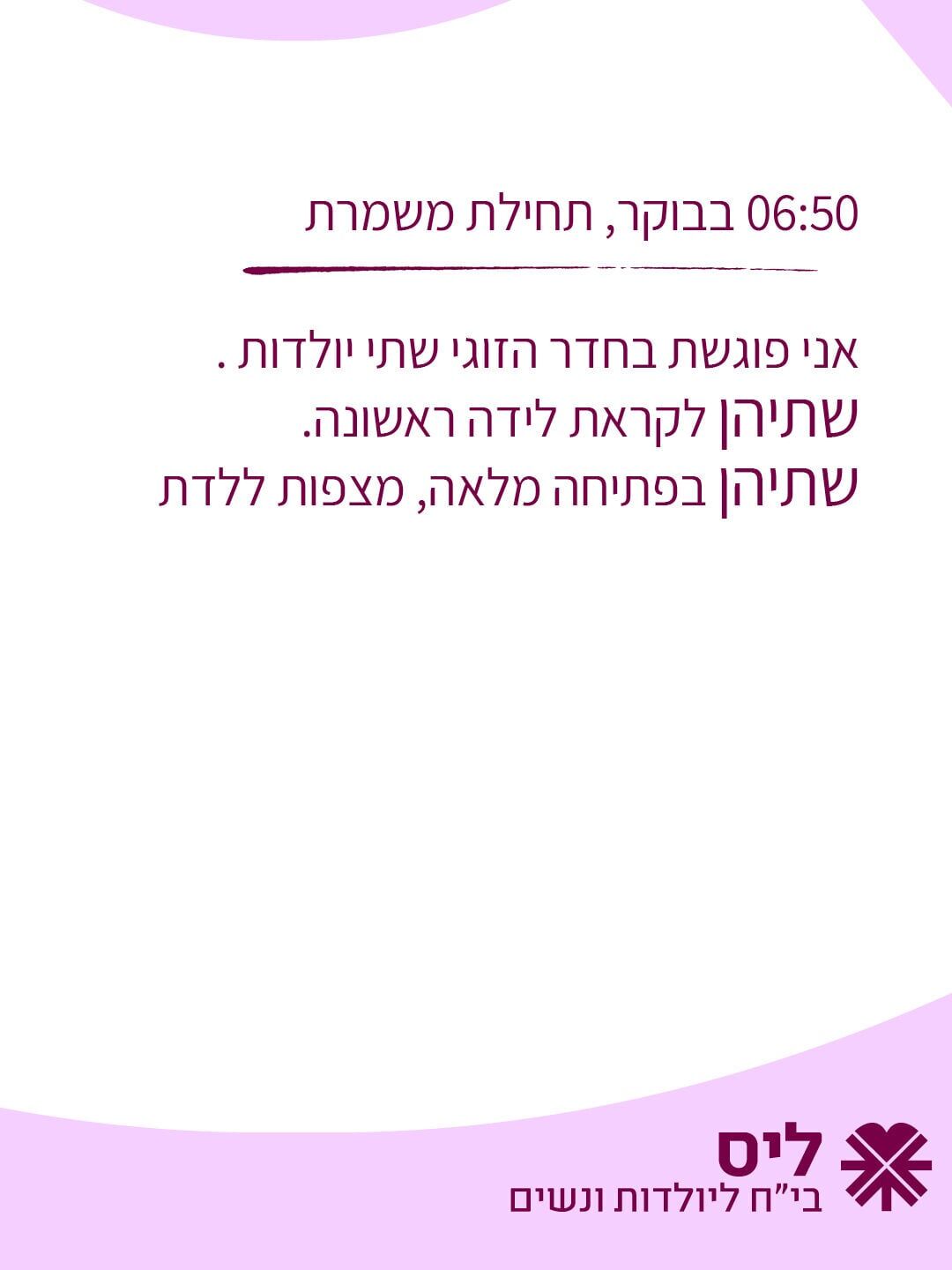 המיילדת שירה אילתי, מצוות בית החולים, חלקה את החוויה הייחודית מתוך משמרת הבוקר שלה. עם תחילת המשמרת בשעה 06:50, פגשה המיילדת בחדר לידה זוגי שתי יולדות לקראת לידתן הראשונה. שתיהן כבר הגיעו לפתיחה מלאה וציפו ללדת, כאשר רק וילון מפריד ביניהן.