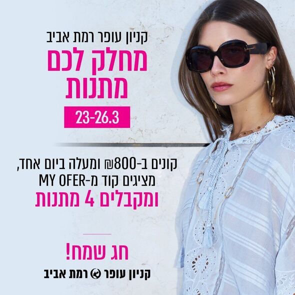 קניון עופר רמת אביב יוצא במבצע מיוחד ללקוחותיו לקראת החג. המבצע יתקיים החל מהיום (שני) ועד ליום חמישי השבוע, בין התאריכים 23 עד ה-26 במרץ.