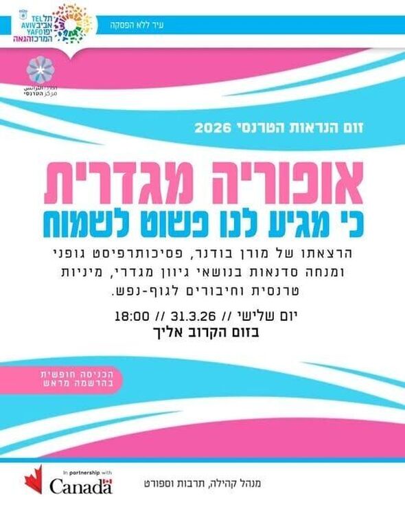 ההרצאה תועבר על ידי מורן בודנר, פסיכותרפיסט גופני ומנחה סדנאות בנושאי גיוון מגדרי, מיניות טרנסית וחיבורים לגוף-נפש. במהלך המפגש, שיתמקד בחווית האופוריה המגדרית, יידונו מחקרים בנושא, ישותפו חוויות אישיות מהקהילה, וכן ישולב תרגול קצר שמטרתו לייצר חיבור ותחושה נעימה בגוף.