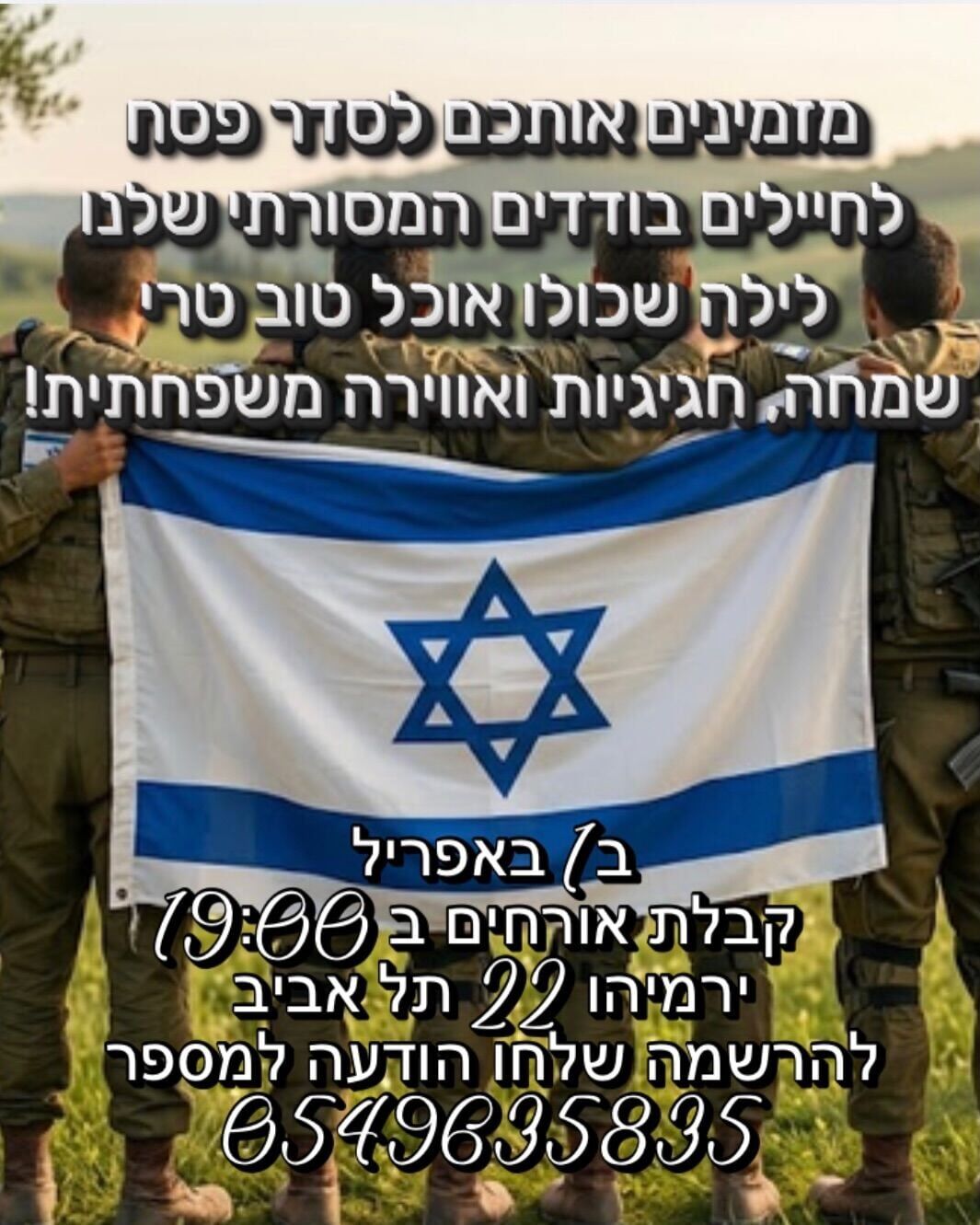 לקראת חג הפסח שיחול היום (רביעי), ה-1 באפריל, מתארגנת יוזמה מרגשת למען החיילים הבודדים. בר הפסטה והיין "פסטלה" (Pastella) מבית קבוצת J17, מזמין את החיילים הבודדים לחגוג יחד את ליל הסדר ולהבטיח שאף חייל לא יישאר לבד בחג.