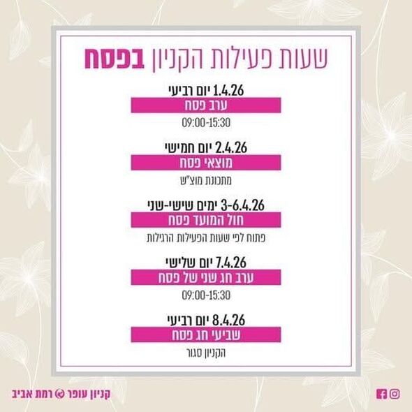 - יום שלישי, 7 באפריל (ערב חג שני של פסח): הקניון יפעל שוב בין השעות 09:00 ל-15:30.