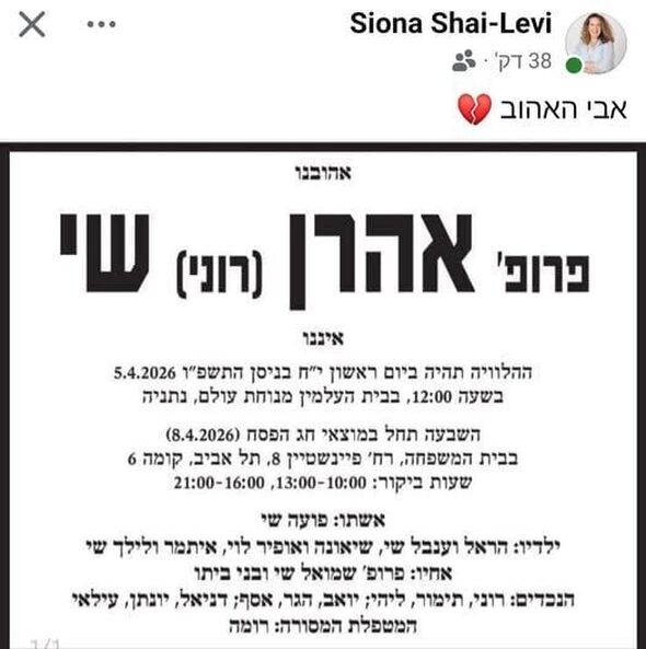השבעה תחל במוצאי חג הפסח, ביום רביעי ה-8 באפריל 2026, ותתקיים בבית המשפחה ברחוב פיינשטיין 8 בתל אביב, בקומה השישית. שעות הביקור שנקבעו הן בין השעות 10:00 ל-13:00, ובין 16:00 ל-21:00.