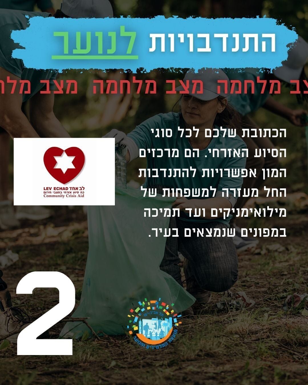 כוח סיוע אזרחי במצבי חירום, המשמש ככתובת לכל סוגי הסיוע האזרחי. הארגון מרכז מגוון רחב של אפשרויות התנדבות, החל מתן עזרה למשפחות של משרתי מילואים ועד לתמיכה במפונים השוהים כעת ברחבי תל אביב.