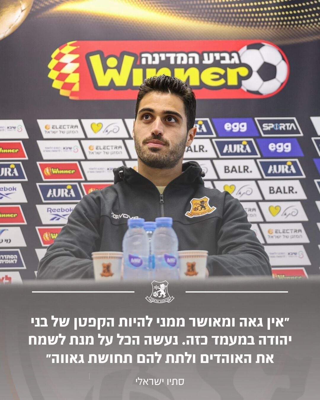 גם קפטן הקבוצה, סתיו ישראלי, התייצב מול המיקרופונים והביע את התרגשותו הרבה לקראת המעמד החשוב. "אין גאה ומאושר ממני להיות הקפטן של בני יהודה במעמד כזה", שיתף ישראלי והבטיח לקהל: "נעשה הכל על מנת לשמח את האוהדים ולתת להם תחושת גאווה".