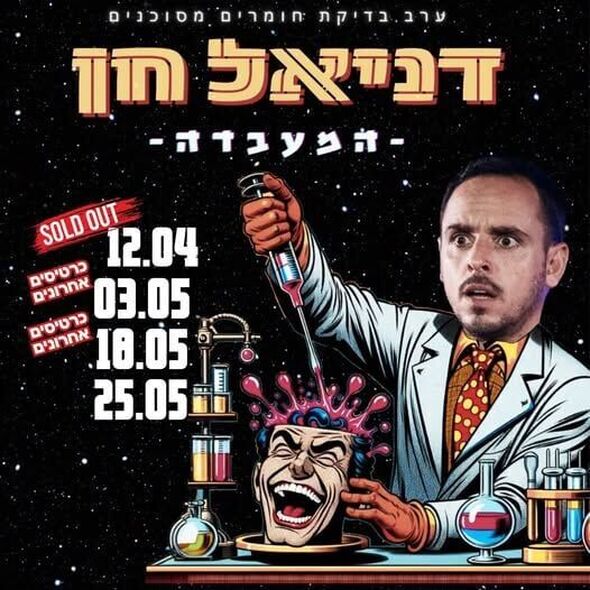 המופע של הסטנדאפיסט דניאל חן, "המעבדה - ערב בדיקת חומרים מסוכנים", ממשיך לעורר עניין רב. כל הכרטיסים שהוקצו למופע שתוכנן להערב (ראשון, 12 באפריל) במועדון הסטנדאפ פקטורי בתל אביב-יפו חוסלו לחלוטין מראש.