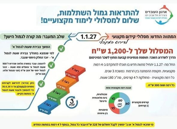 ארגון העובדים בעיריית תל אביב-יפו מכריז על מתווה חדש למסלולי קידום מקצועי עבור הדירוג המנהלי, תחת הסיסמה 'להתראות גמול השתלמות, שלום למסלולי לימוד מקצועיים'. המתווה נועד לאפשר לעובדים לשפר את השכלתם המקצועית ובמקביל להגדיל את שכרם.