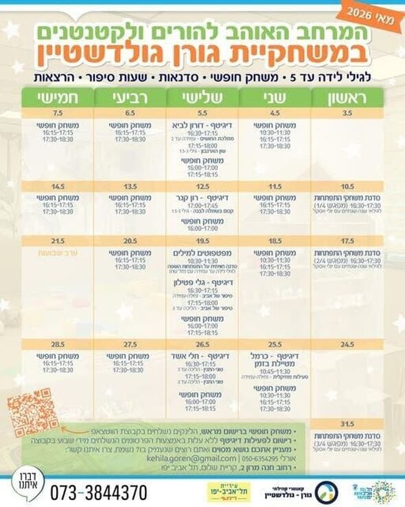 קאנטרי קהילתי גורן גולדשטיין בתל אביב-יפו מזמין את ההורים והקטנטנים, מלידה עד גיל 5, ליהנות משלל פעילויות בחודש מאי 2026. המשחקייה, הממוקמת בשכונת קריית שלום, מציעה מרחב אוהב עם תוכנית עשירה הכוללת שעות משחק חופשי, שעות סיפור, אירועי תוכנית "דיגיטף", סדנאות משחקי התפתחות וסדנת "מפטפוטים למילים".