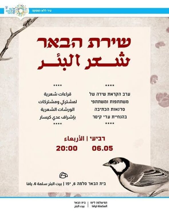 בית הבאר ביפו יארח ביום רביעי, 06/05, אירוע מיוחד של הקראת שירה ומוזיקה, וזאת לכבוד סיום המחזור השמיני של סדנאות השירה בהנחייתה של המשוררת עדי קיסר.