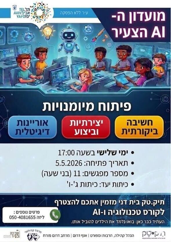 מועדון בינה מלאכותית לילדים ייפתח במרכז קהילתי בית דני בתל אביב ב-5.5.2026